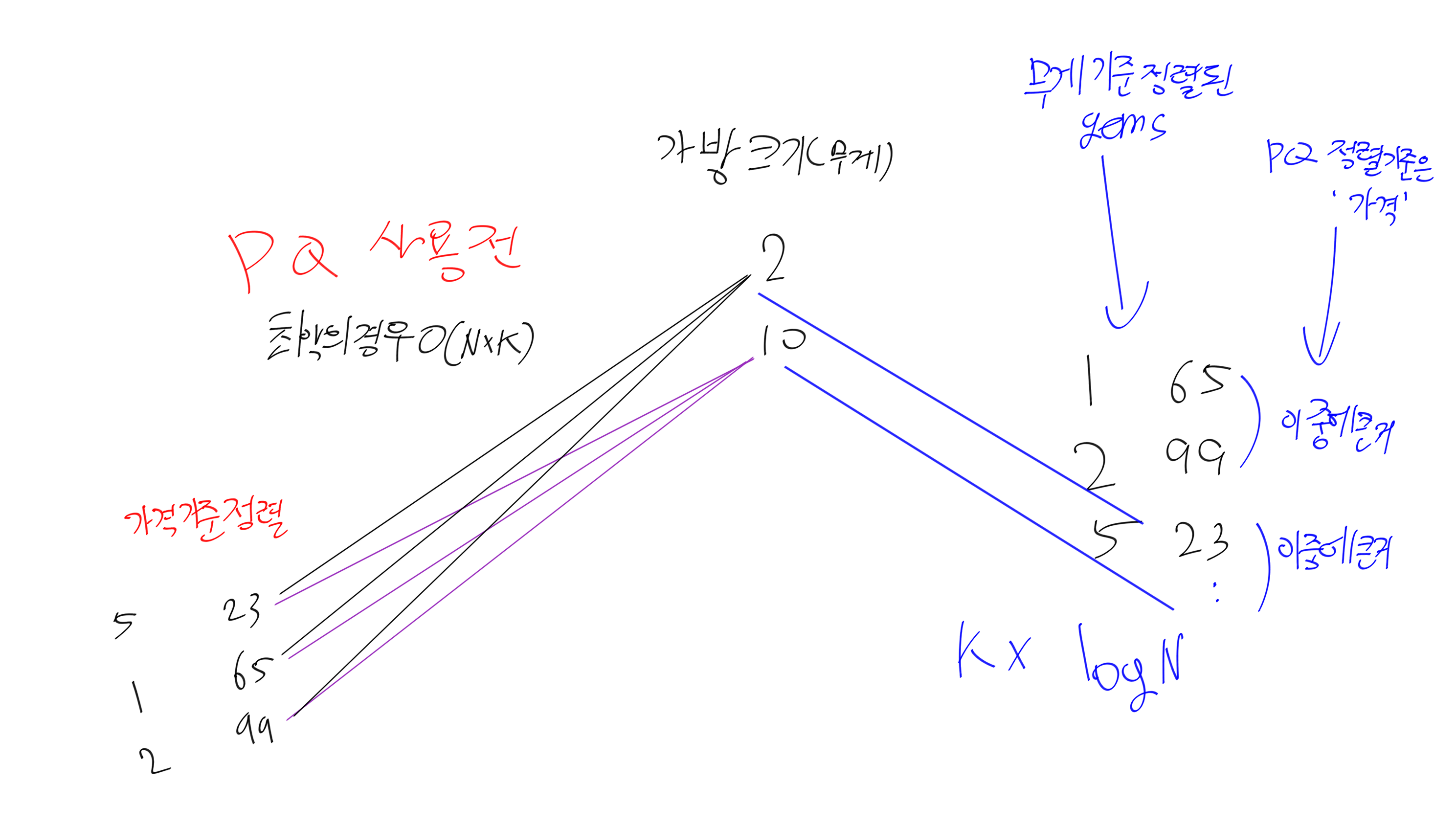 자료구조가 2개 나온다. 가방 배열, 무게-보석 배열 2개다. 이 2개를 원시적으로 2번 순회(아래 왼쪽 그림)하게끔 작동했더니 왠걸 바로 시간초과가 발생했다. 시간 복잡도를 신경써야하는 문제였다. 따라서, 무게 기준으로 정렬하고, 무게를 기준으로 한번 순회를 진행하며, 가방 크기에 맞지 않는 보석으로 가면, pq에서 가격이 가장 비싼 보석하나를 가방에 넣고 다음가방으로 이동해서 진행한다.
