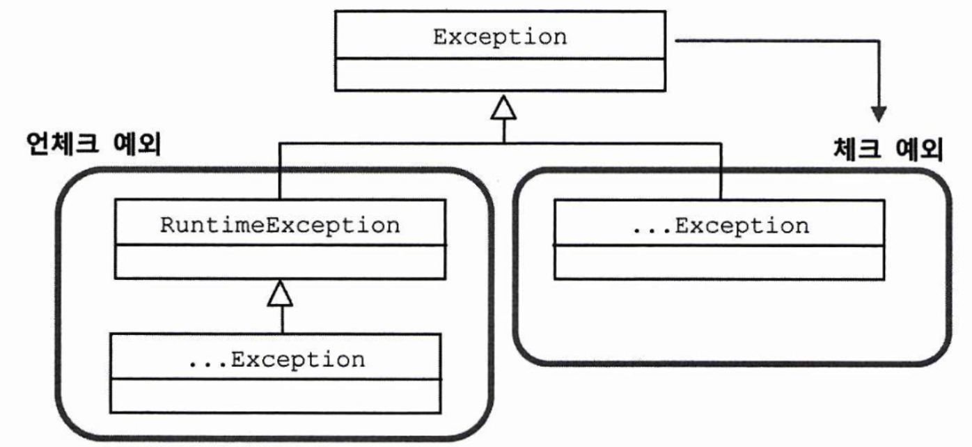 Exception과 그 서브클래스로 정의되는 예외들은 에러와 달리 개발자들이 만든 애플리케이션에서 발생한 예외에 사용된다. Exception클래스는 체크 예외와 언체크 예외(unchecked exception) 로 나뉜다. RuntimeException을 상속한 클래스들을 언체크 예외라고 부른다.