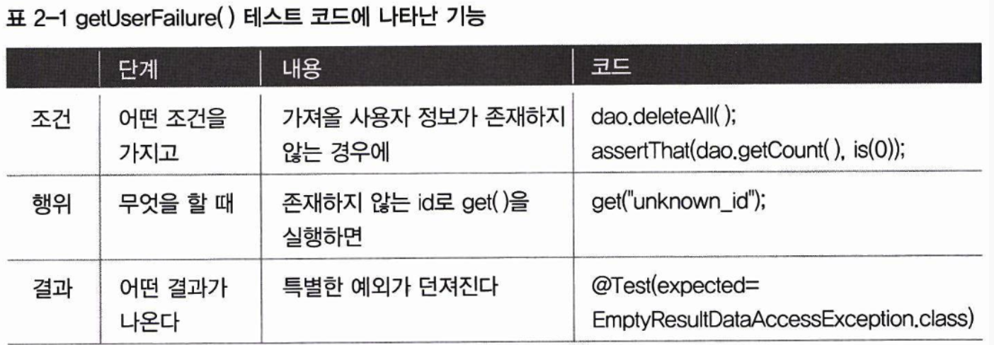 위에서 작성한 getUserFailure()를 살펴보자. 이 테스트에는 만들고 싶은 기능에 대한 조건과 행위, 결과에 대한 내용이 잘 표현되어 있다. 테스트 코드의 내용을 정리해보자.
