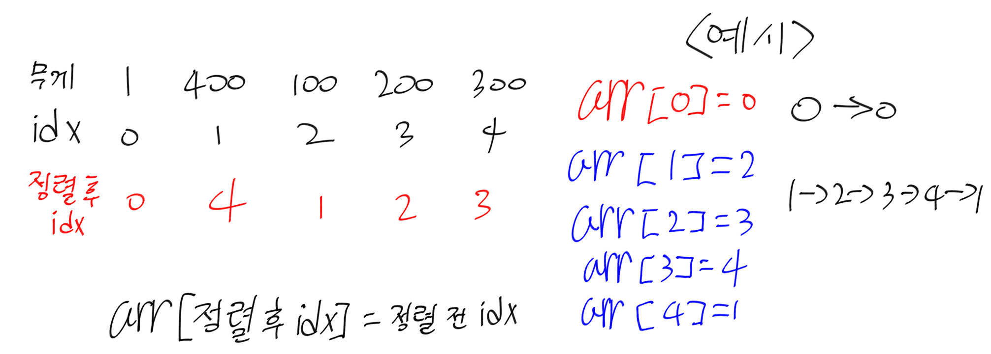 문제를 해결할 때는, 2차원 배열 arr 을 만들고 - [[짐 무게, 정렬 전 인덱스], ...] - 짐 무게 기준으로 정렬하여